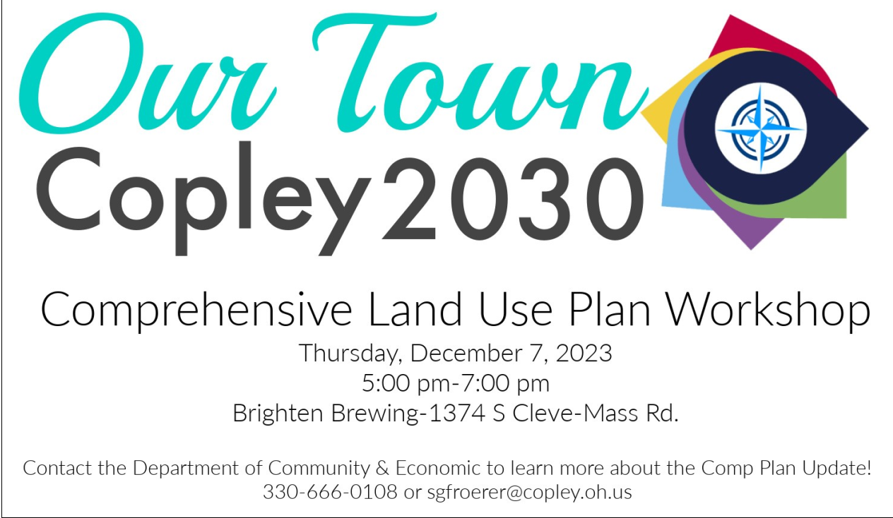 On Thursday, Dec 7, 5-7 pm, the Land Use Plan Workshop will begin @ Brighten Brewing, then @ 7:30 pm Copley Township Zoning Commission Meeting business will continue at Copley Town Hall. Hope to see you there.